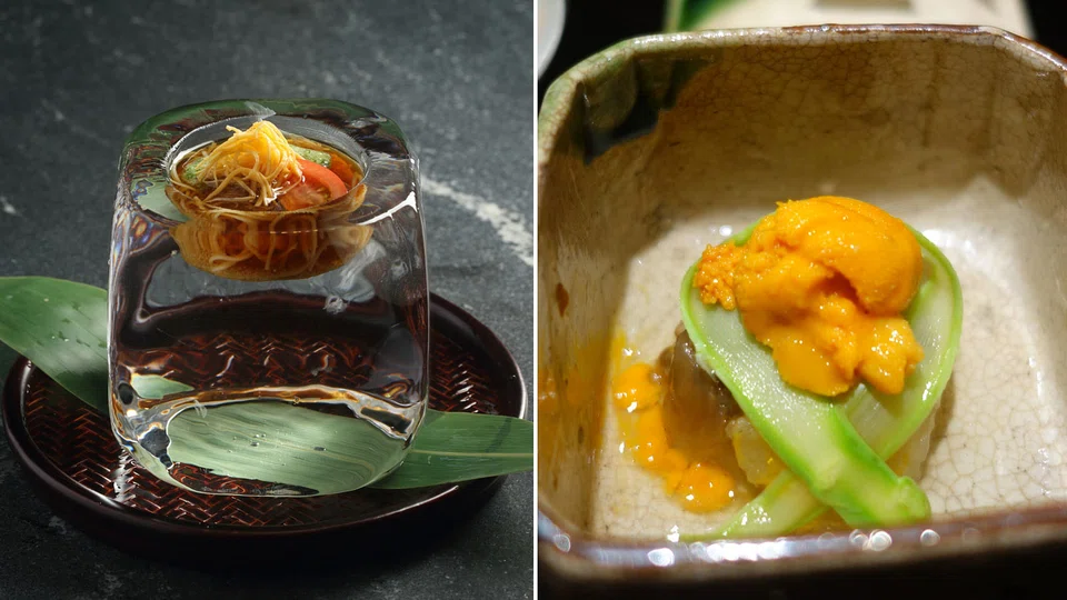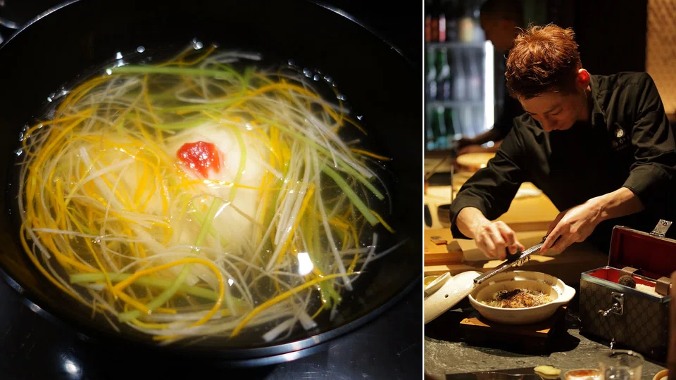 While Chef Nishi looks pretty chill, his actions say otherwise. Especially when he literally plucks one appetiser back from under our nose when he notices his apprentice hasn't plated it to his standards. He painstakingly reworks it and gives it back - a cube of braised wagyu and wintermelon, both braised to the same melt-in-the-mouth texture, topped with a dollop of clean, creamy uni. It's a mild-mannered sidekick to the livelier marinated aji - slices of smooth horse mackerel in a vinegary seaweed sauce garnished with a spear of pickled ginger flower and glittery gold leaf.