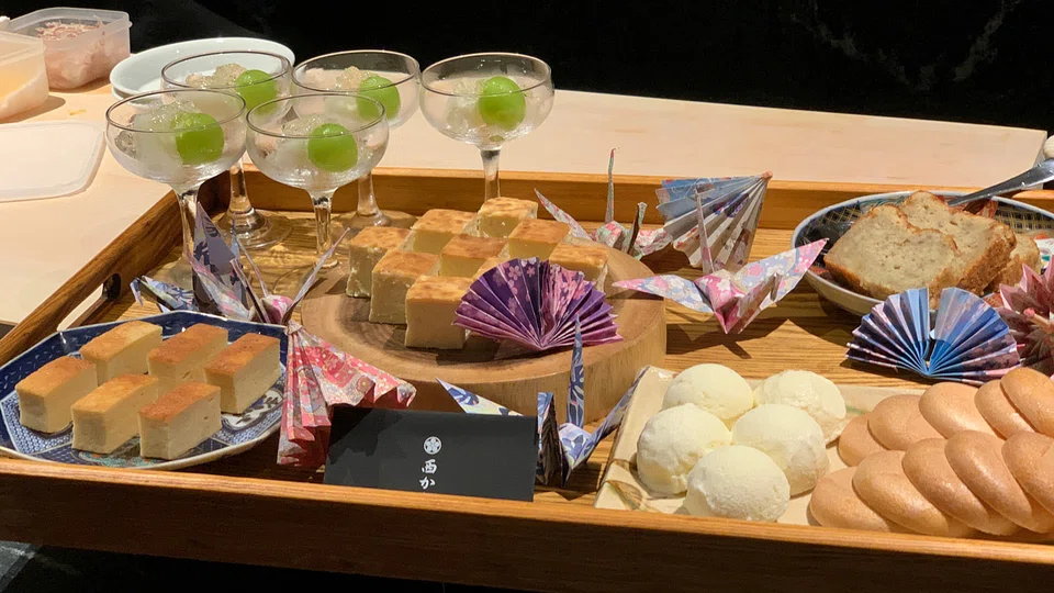 Dessert is fun, since we've never seen a whole dessert tray in a Japanese restaurant, much less had an invitation to sample everything on it. It's a pretty display of little pastries and ice cream, decorated with paper umbrellas and origami cranes. The best is the monaka, crispy wafer sandwiched with sea salt ice cream - really good grainy, milky ice cream with hints of salt. Next best is a parfait glass of clear jelly and pear cubes with a single Shine muscat grape. Little cheescake cubes are creamy sweet, while the banana bread tastes of banana first and cake second. But it's a commendable effort by Chef Nishi's young hardworking apprentice who made everything, and whom the chef clearly gives credit to.