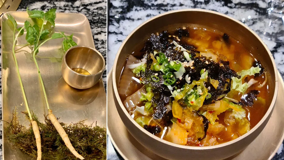 A whole deep-fried rockfish follows, bathed in a clear sweet and sour sauce, almost Chinese style. There's a blob of marinated beef tartare that's an acquired taste, rolled with pear strips in seaweed. Then there's seafood hotpot, with scallop, mussels, squid and shrimp in a thickened clear broth with rice crackers to dip. Followed by a potent galbi jim or braised short ribs in a rich, sweet-savoury gravy with thick ginseng roots and melting soft pumpkin wedge.
