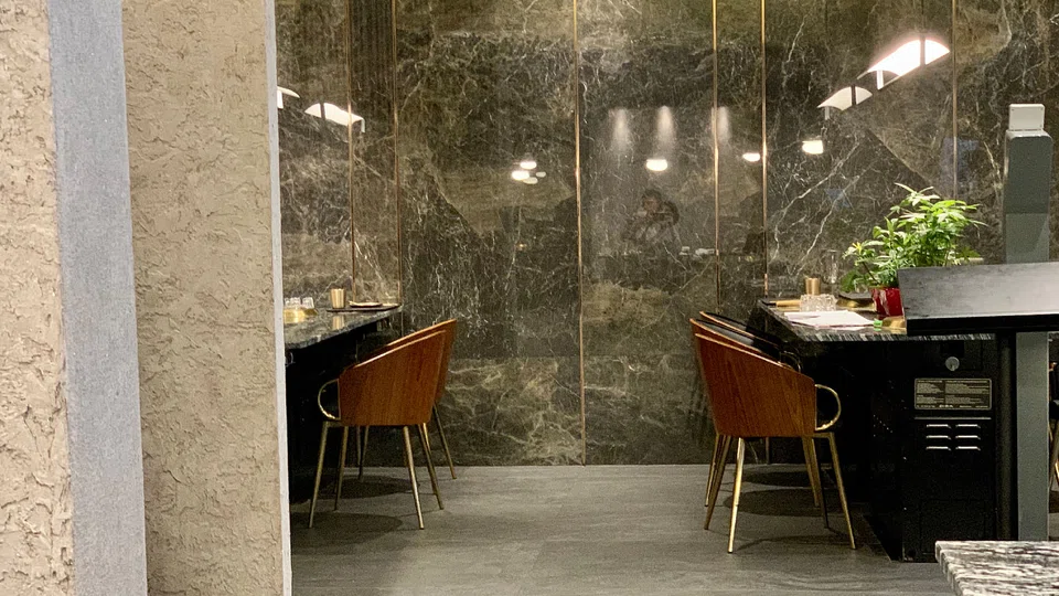 It's not as fine dining as we expect, with promotional notices stuck on its auto doors and a large industrial canteen-like kitchen taking centre stage, negating its attempts at style with black granite-like walls and marble-ish tables. Copper grills embedded in the tables peg this as a Korean barbecue, except that there are a lot more extras that come with it.