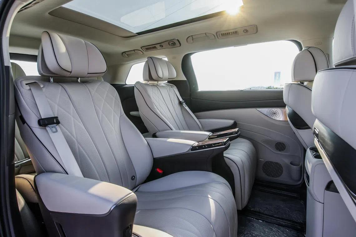 For half the price of a German limousine such as the Mercedes-Benz S-Class, it has much more room inside than one, thanks to its boxy shape. The middle row seats are Business Class affairs, with individual touchscreens for controlling everything from the air-conditioning and entertainment systems, to adjusting the seatback and foot rest to your preferred angle of recumbency.