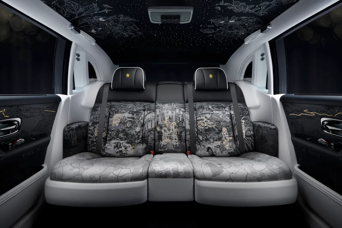 Within each cabin are 77 interior artworks that depict the 100-year history of the Phantom, the ultra-luxury limousine that debuted in 1925 and is the English carmaker’s quintessential model.