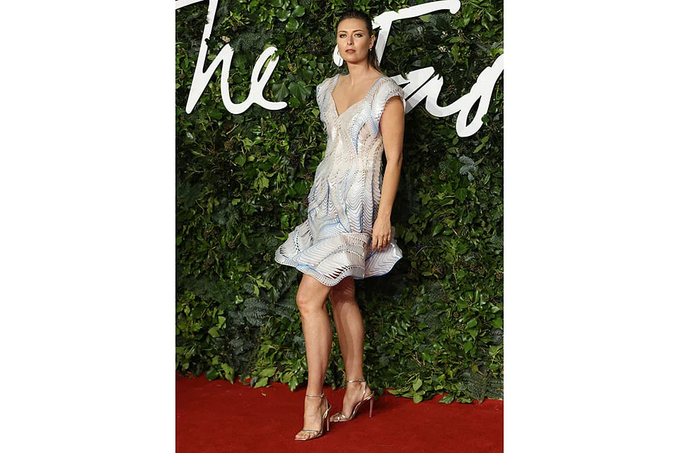 The retired Russian tennis star arrived a few moments later in a dress created from recycled water bottles, a collaboration between Iris van Herpen and Evian.