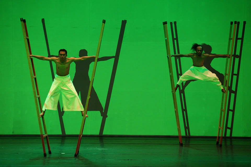 Yusril was also interested in the social system of the culture which takes a top-down approach - the way society is governed. In contrast to how a theatre piece might develop out of the story or text, Yusril decided to create the dance by using everyday objects for their symbolism, and then he connected text to the objects. A ladder, for instance, could symbolise the power structure of the society which has a top-down approach.