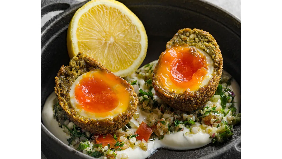 Even the vegetarian free range scotch egg (S$15) doesn't make you miss the pork sausage wrapping of the original. Here, a layer of lentil-based falafel is wrapped around a perfectly done boiled egg with a soft runny yolk, and fried for that crisp outer surface. Yogurt-smothered tabouli completes it.
