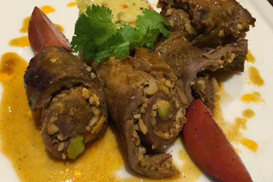 Some dramatic showmanship follows when a dome is lifted off the next dish, releasing a whiff of maple wood smoke which engulfs the stuffed lamb parsinda ($38) - a fussy dish of flattened lamb rolled over a stuffing of chopped nuts and raisins that overshadows the meek pile of couscous beside it. The lamb looks dry but isn't really, and it doesn't look gamey but tastes it. The work that goes into preparing the lamb and stuffing doesn't quite live up to the taste, although it gets a bit of lift from the yoghurt raita that comes with the Hyderabadi chicken biryani ($30) that we order. The latter comes in a little Chinese claypot filled with fluffy spiced basmati rice that is dressed with delicate and fragrant spices and tinged with saffron. It's let down by chicken pieces that have lost their moisture, making you wish there was a lamb or beef version available.