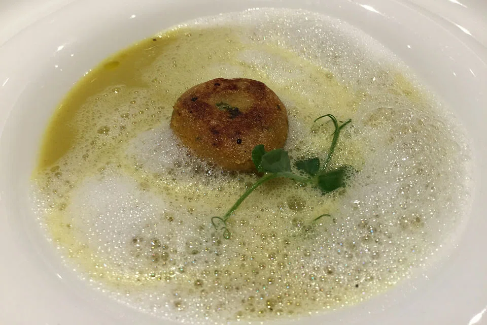 Last week, we found ourselves at the new Saha, a month since it moved into the National Gallery. It is pretty in a conventional fine dining way, a balance of neutral tones and glitter in the form of reflective glass pillars and polished copper lamps dangling from above. The table lamps with their warm glow and henna-like design are the only reminders of the old restaurant. And the vegetable espuma.
