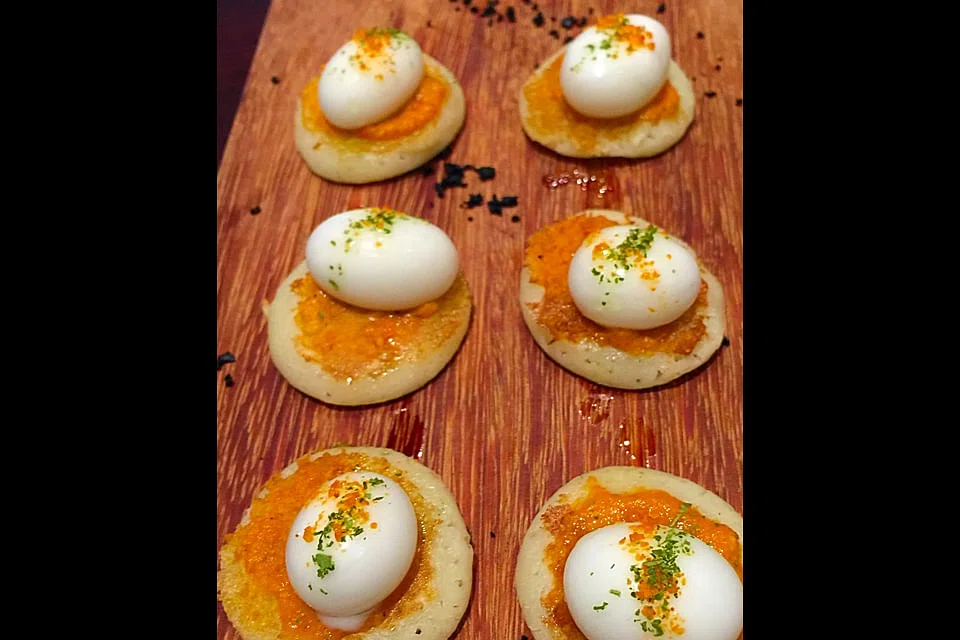 When we need help deciphering the menu, the maitre 'd steps in with infinite patience and warm, polite manner. After the opening nibbles of mixed pappadum and a salty-sweet apple cinnamon popsicle, the mini masala utthapam ($14) knocks us for a loop with its new-wave interpretation that is both brilliant and delicious. Little chewy blini-like pancakes are smeared with tangy spicy chilli chutney and topped with a spherification of coconut milk - the jelly-skinned pearls of coconut burst in the mouth to lend cooling richness to the fermented rice pancakes.