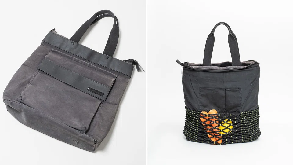 DESPITE its frayed corners, Arnold Goh still treasures this Calvin Klein Tote bag, because it was bought with his first pay cheque back in 2007. He now uses it as a grocery bag, although it can barely hold anything more than two cartons of milk. Textile designer Tiffany Loy found a way to expand the bag's capacity by turning it inside out and stitching cotton cords to the base and lower half. By doing so, the areas which are more susceptible to scratches now have added protection. In addition, cords also form a mesh to hold extra items.