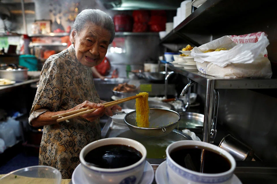 LEONG Yuet Meng cannot walk more than 10 metres without assistance. Yet, the frail 90-year-old still runs a wonton noodle stall in downtown Singapore, selling at least 200 bowls on any given day.