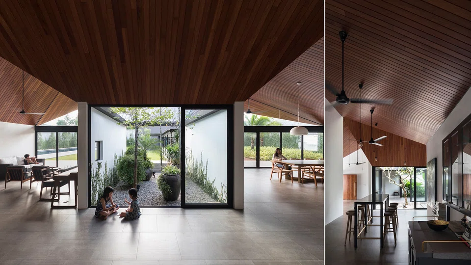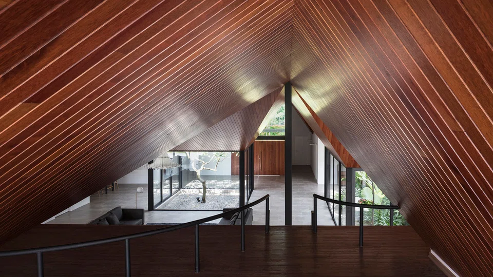 The architects initially had the idea to introduce skylight into the roof, but they changed their minds, as direct sunlight falling into the home during the mid-day isn't ideal. They had initially designed for the house to have conventional pitched roofs, but Mr Seetoh had the bright idea to flip the roof upside down, creating a series of funnel-like roofs, which are best seen from above.