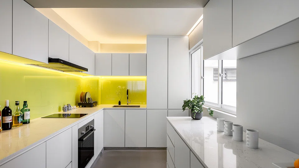 Just like his choice of materials, Mr Toh keeps the colour palette simple - mostly shades of white, blue and grey to give the apartment a uniform look. Random pops of colour, such as a mustard cushion, and the yellow backsplash in the kitchen are all carefully orchestrated. To jazz up the home, Mr Toh prefers something more organic, such as plants and flowers.