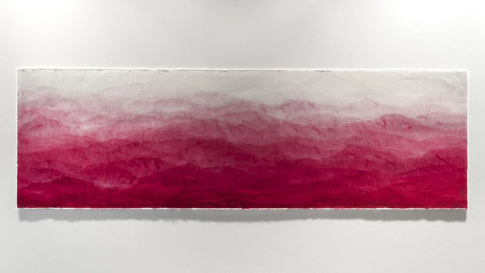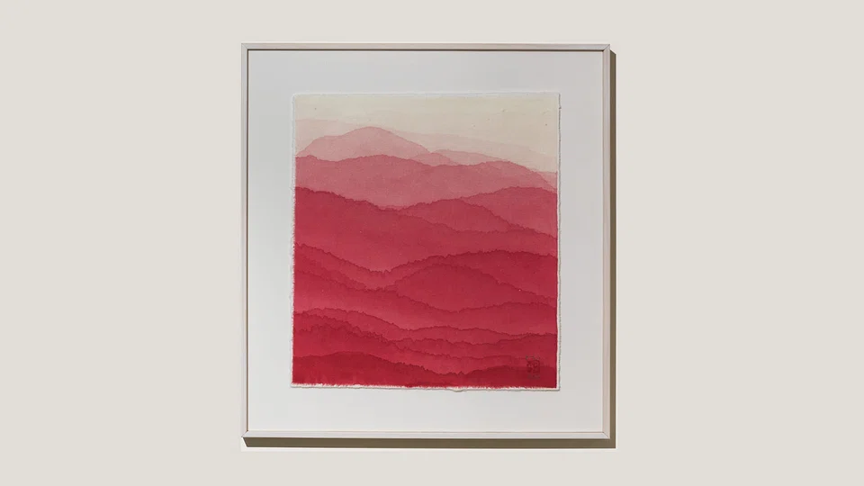 ONENESS by Kim Minjung features a series of works on Korean mulberry hanji paper, rendered in Indian ink and watercolour. The works feature undulating washes of colour, applied painstakingly layer by layer using drops of ink mixed with water in incremental amounts. The effect creates an illusory sense of depth, evoking mountains in the crimson mist at dusk and in the rolling fog before daybreak. The contemplative quality of the works invites viewers to experience a sense of unity with nature in its most infinite and eternal.