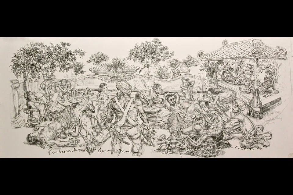 Executed on much larger pieces of paper - one work stretches up to 4.8 metres long - they feature historical figures such as Parameswara, Admiral Cheng Ho and Sir Stamford Raffles amid verdant landscapes of the past. These images, however, are no straight retelling of history. Rather, they seek to highlight contemporary issues of power, sexuality and politics through the evocation of history.