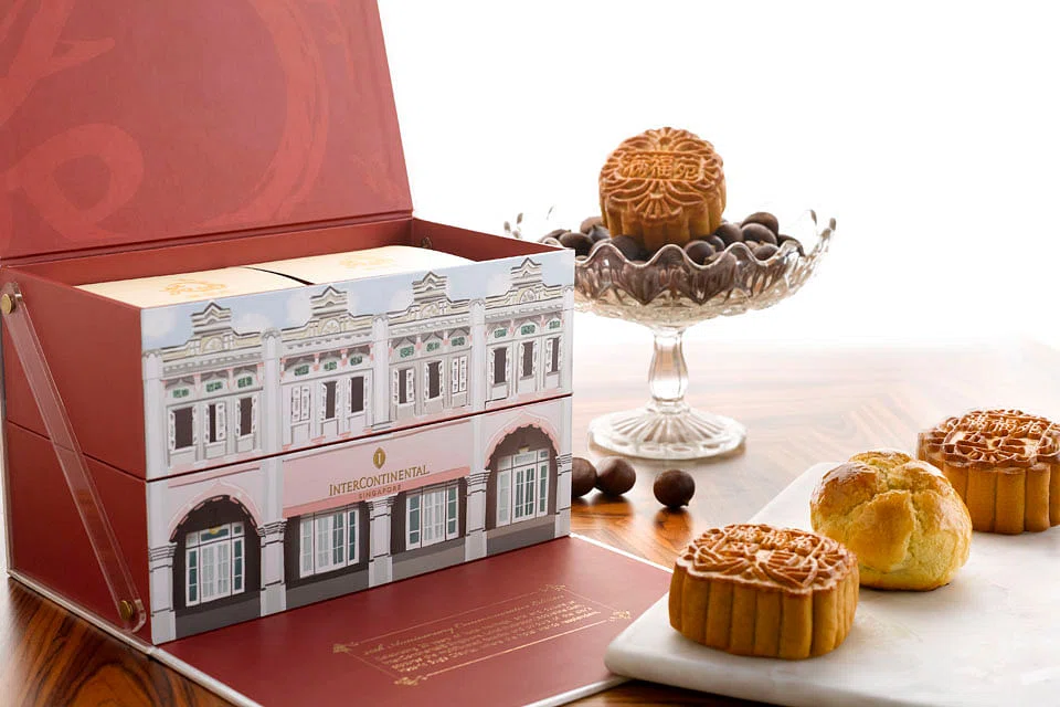 Don't overlook what's within either. Inside the InterContinental Singapore's 20th Anniversary Collector's Edition (S$105) includes their newest limited edition baked maple-glazed Shanghai mooncake with single yolk. Also new is their Snowskin Tea Collection (S$66) featuring Earl Grey & Baileys truffle, Japanese matcha, oolong & black sesame, and rose & pistachio.