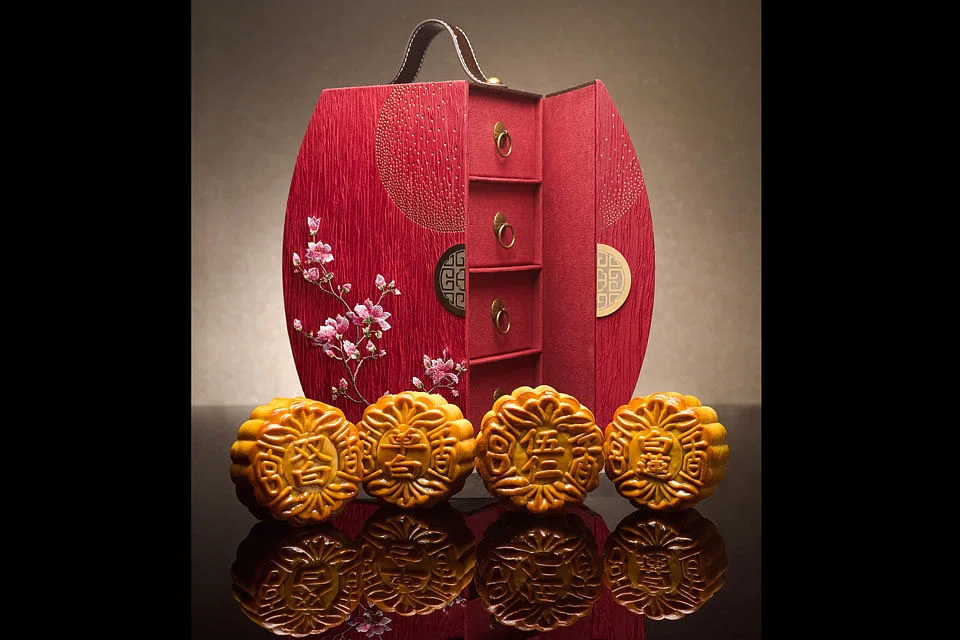 Jade Restaurant at the Fullerton Hotel has come up with an exquisite mooncake box this year - a striking red set of four drawers with a golden plum blossom design.