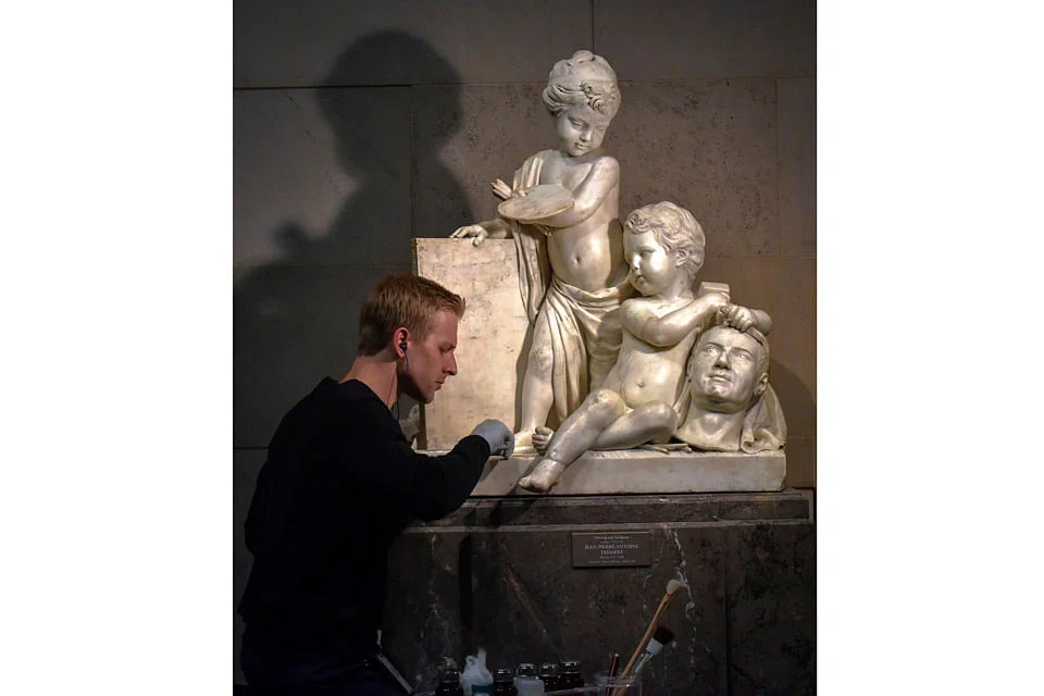 Perched on a wheeled stool under a bright spotlight, Price leaned into a 200-year-old marble sculpture carved by Frenchman Jean-Pierre-Antoine Tassaert, his gloved right hand using a cotton swab to remove decades of grime from its base. With ear buds helping to block out his surroundings (delivering a mix of Louis Armstrong and true-crime podcasts from his smartphone), the 32-year-old conservator twisted a fluff of cotton onto a wooden stick, dipped it in a special water solution and painstakingly worked it over a small area of marble. He repeated the process, again and again and again, for hours.