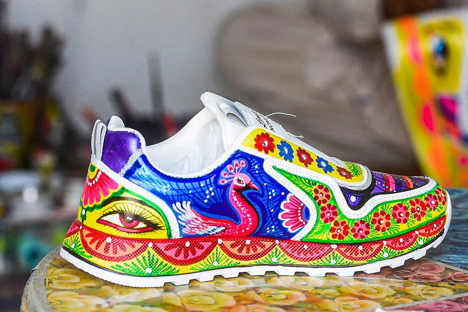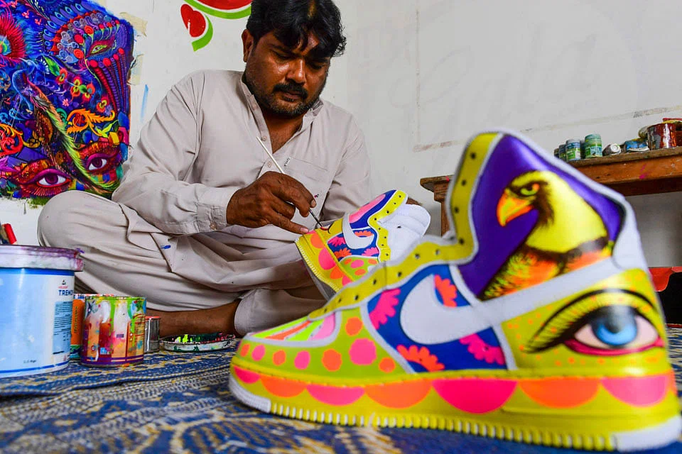 Cross-legged in his Karachi rooftop studio, he flips a pair of high-top Nikes to reveal the image of a luminous pink hawk and a gazing yellow eye, framed by hypnotic bulbous fringes.