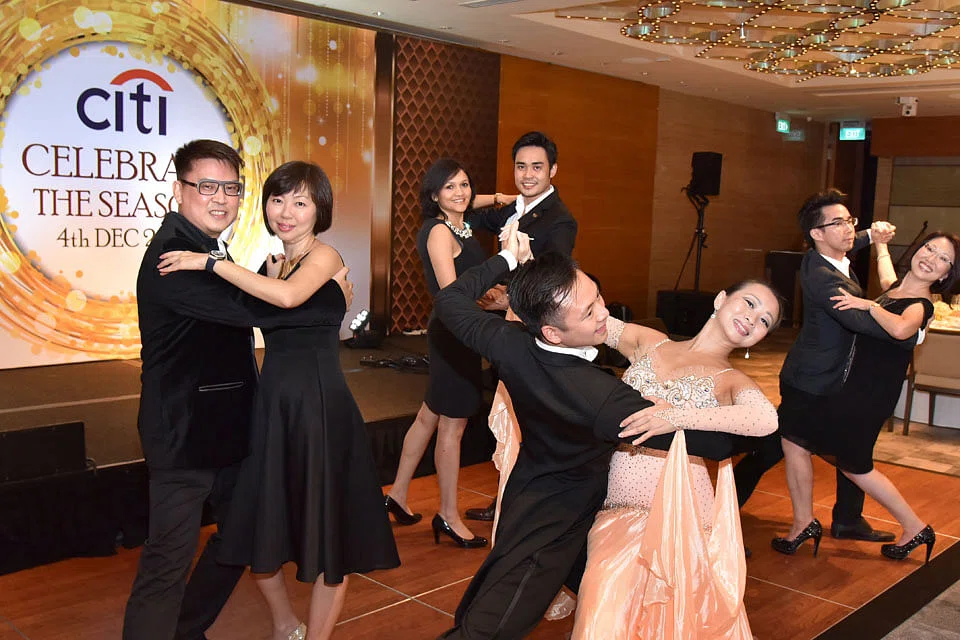 CHRISTMAS thanksgiving came early for some 200 guests of Citi Singapore. They were hosted to a year-end Client Appreciation Dinner at the Grand Hyatt Hotel on Friday. It was an evening of good food, entertainment and "Dancing with the Stars". Guests had the opportunity to pick up basic waltz steps from two well-known professionals. Citi had engaged ballroom dancers Soon Kian Yong and Yap Zhi Xin, who have represented Singapore internationally to teach clients the five basic waltz steps.