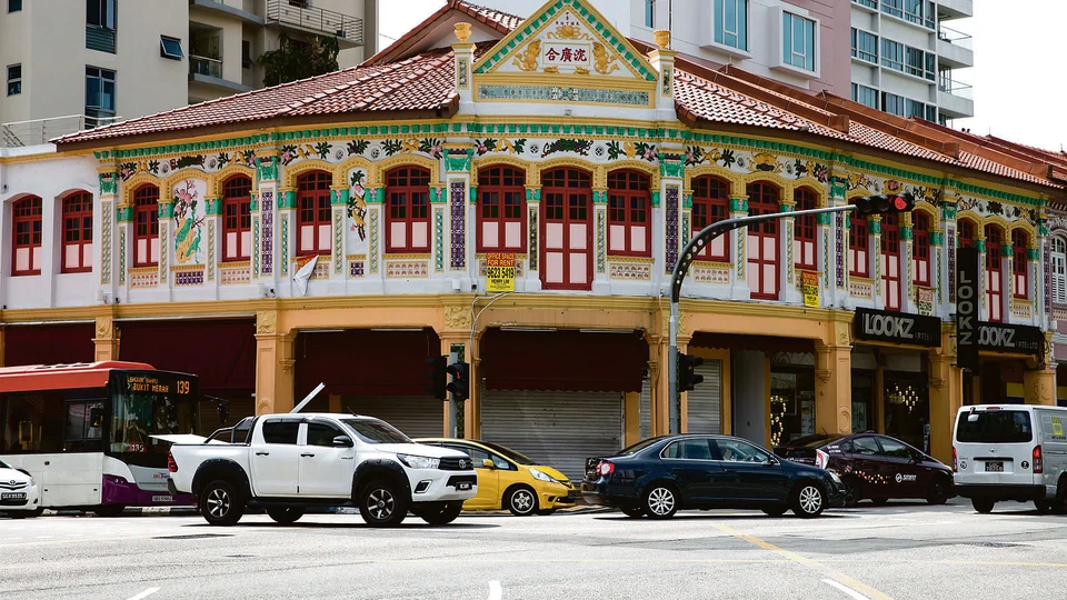 Begin at 230 Balestier Road, where two Art Deco shophouses face each other on the corner of a side street. Art Deco was an architectural trend that was popular around the 1930s and these buildings typically feature geometric-shaped details. They are very different from the stretch of colourful and ornate shophouses further down the road, from 292 to 312 Balestier Road. These were built in 1926 by a female developer named Madam Sim Cheng Neo, and are known as Sim Kwong Ho shophouses, as indicated by the characters inscribed on the facade.