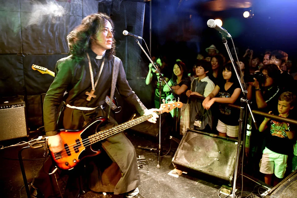 MOST days, Lutheran pastor Kazuhiro Sekino preaches to his congregation in a soft voice with religious hymns playing in the background of a Tokyo church. But as night falls, he hits a smoky stage criss-crossed with whizzing strobe lights, shedding his pious day job in a battle of the bands against a group of Buddhist monks.