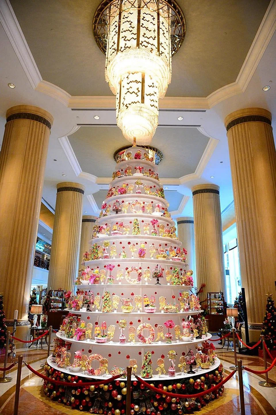Shining brightly this year is the Candy Sweet Christmas tree of Shangri-La, Singapore, which combines Christmas decorations and festive treats - make that 150 candy arrangements and lollipops - in one impressive 5-metre tall tree.