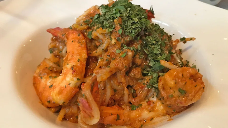 Kueh Pie Tee (S$17), usually served in miserly and expensive portions, arrives in a generous portion of eight "top hats" filled with braised turnip and topped with sliced prawns. The fried baskets lose their crispness from being pre-filled for convenience, but otherwise they're perfectly edible.