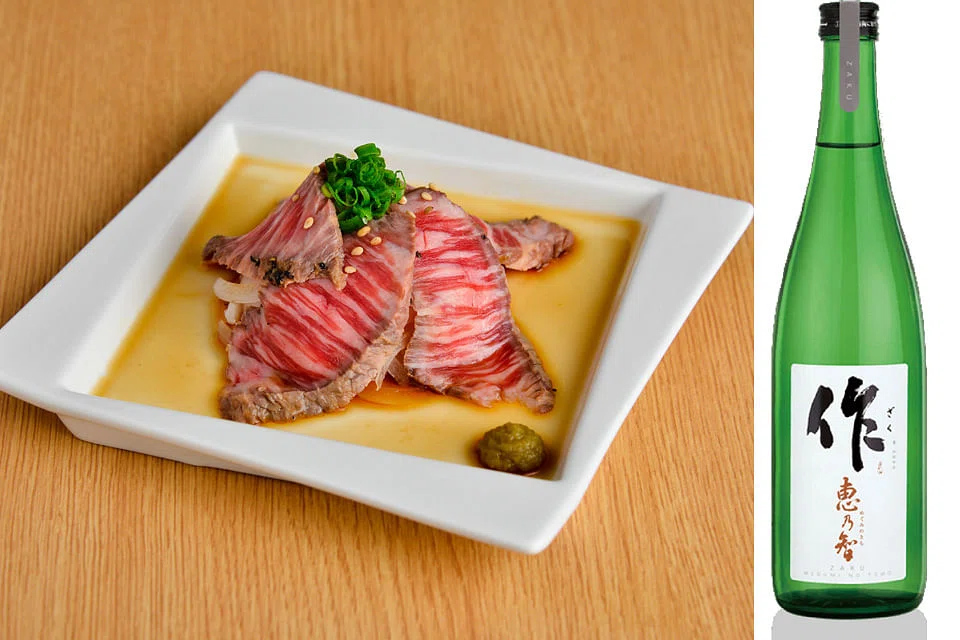 Another pairing which stands out is the beef tataki with modern-styled sake Zaku Megumi no Tomo (S$84). The seared beef slices bring out the umami flavours in the tasty sake.