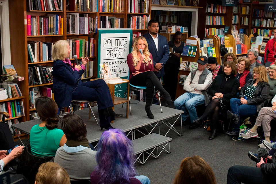 Stormy Daniels, at a Washington bookshop to promote her memoirs, compares the president to Burt Reynolds - but with socks.
