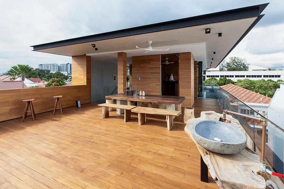 The bedrooms are located on the second floor, one for Mr Soo and Cindy, a second for Marcus, and a third, which will be for the grandchildren. Planters run along the length of the bedrooms, which add greenery to the interior space while providing a soft touch in contrast to the hardwood walls.