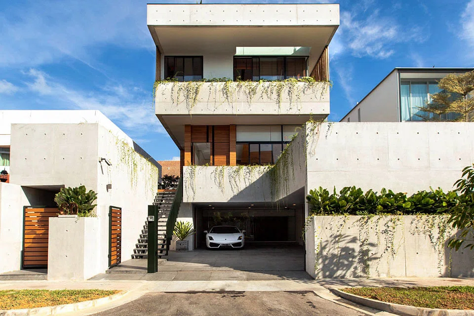 Located in the Tanjong Katong area, the 9,000 square foot house sits snugly on a tight 6,400 sq ft piece of land, yet on the inside, the home feels spacious. Due to flood level planning controls, the first storey has been raised a full floor above the 'basement' entrance, which means that when visitors first enter the home from the road, they are in fact, entering the basement.