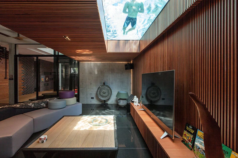Part of the pool has a glass bottom, which looks into the basement: "It helps to let in more light below." He admits that the pool doesn't get as much use as it should, as the family is more caught up with other fitness activities.