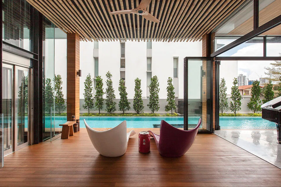 Up on the first floor is where the main living room is, together with the dining area and a small deck which all look out on to a 25 m saltwater lap pool. Mr Soo explains that saltwater is kinder on the skin and hair compared to chlorinated pools. "Naturally, I built the pool's filtration system," he says.