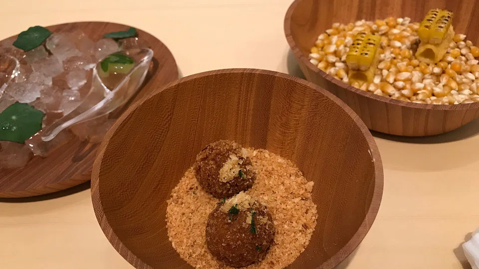 An Odette-style snack plate doesn't disappoint: a trio of bites such as a refreshing gelatine sphere encasing a burst of tomato consomme and cucumber; super sweet grilled Hokkaido corn atop a corn cracker filled with corn purée; and a warm pumpkin croquette.