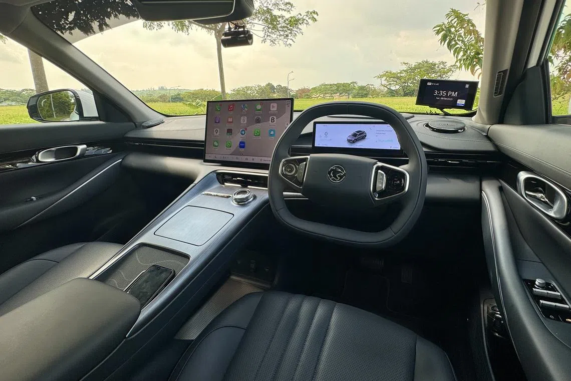 Up front, an impressively sharp 15.4-inch display takes centre stage. It’s smooth and lag-free, but still needs polish. Apple CarPlay was glitchy on my test car (I had to reconnect my phone often), and Android Auto is currently missing in action. The native navigation system doesn’t work in Singapore, so it can’t find charging stations here. I expect software updates to sort those eventually, and there is a companion smartphone app in the works.