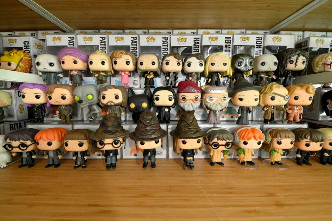 On the other side of the room are floor-to-ceiling shelves, filled with more Harry Potter merchandise, including an impressive collection of Funko Pop! figurines, such as those of the three main characters in their sorting hats, as well as others.