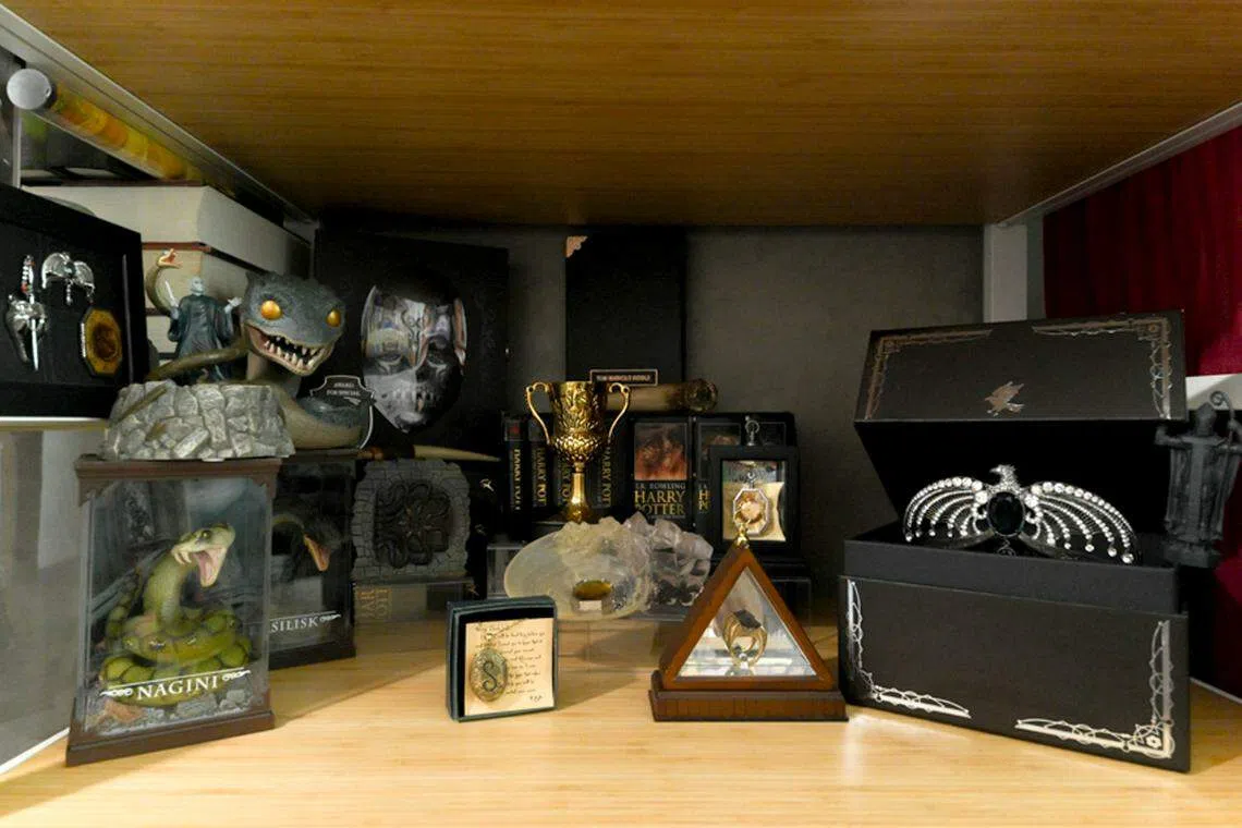 Ma has dedicated another shelf to displaying items used in the Dark Arts, which is any type of magic that is used to cause harm. No surprises then to see that Ma has replicas of all the 7 Horcruxes such as Marvolo Gaunt’s Ring, Helga Hufflepuff’s Cup and Rowena Ravencla’s Daidem. In the Harry Potter series, destroying the horcruxes is the way to kill off Voldemort, the main antagonist.