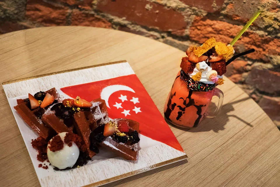 Dig into National Day Waffles - served with a drizzle of blackcurrant sauce, dusted with icing sugar, garnished with blackberries and strawberries, served with vanilla ice cream, and topped with red velvet cake crumbs and pistachio nuts. The waffles are served on a Singapore flag made of red-coloured cream cheese sauce, with the stars dusted with icing sugar (above left).