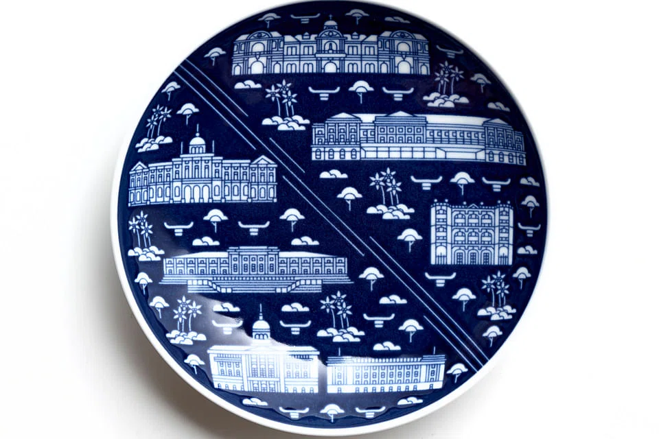 Edwin Low, designer and founder of Supermama, is worried about the rate at which Singapore is rebuilding itself and tearing buildings down. He wants to be able to "lock in images of iconic buildings in Singapore forever", he says. To do this, Supermama is launching The Singapore Architecture Collection of plates. Mr Low hopes to create a whole series of different neighbourhoods in Singapore, but is starting with five spots for now - Singapore River, Marina Bay, Bras Basah, Kampong Glam and Katong. On each plate are illustrations of iconic buildings of the area, such as the Marina Bay Sands, and quirky icons, such as the junks that used to ply the Singapore River.