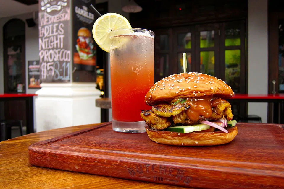 Accompanying the burger are fries seasoned with curry powder and the SG Fling - a Singapore Sling-inspired vodka-based cocktail.