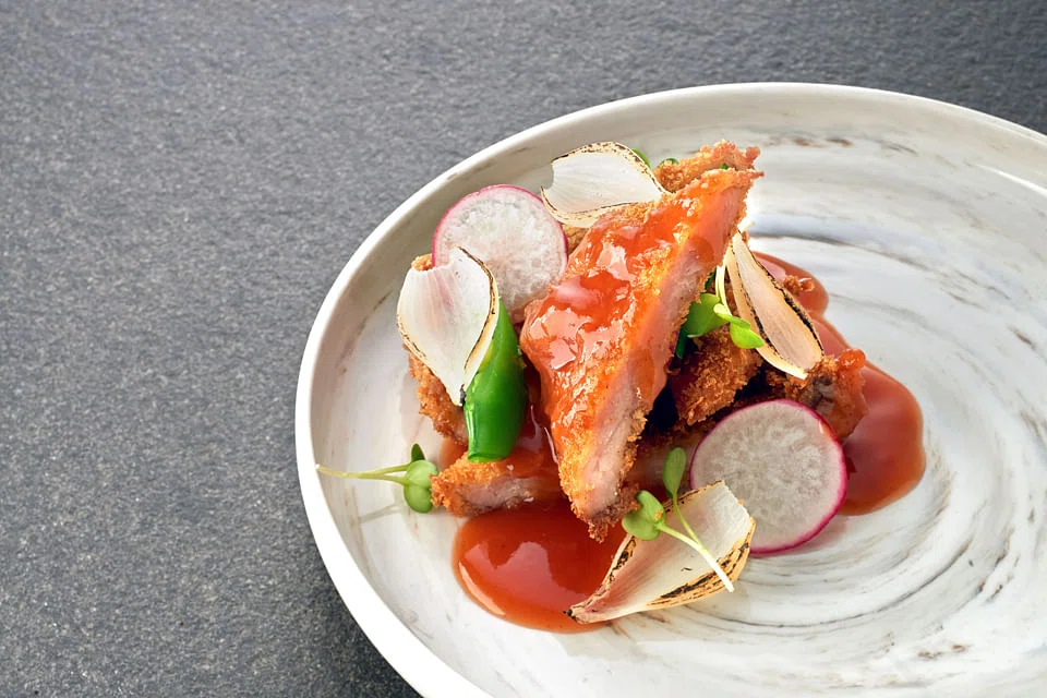 The Pork Chop is perfectly deep-fried to a golden brown, with a sweet and sour glaze drizzled over it. For a healthy balance, the pork is served with thinly sliced onions and snap peas.