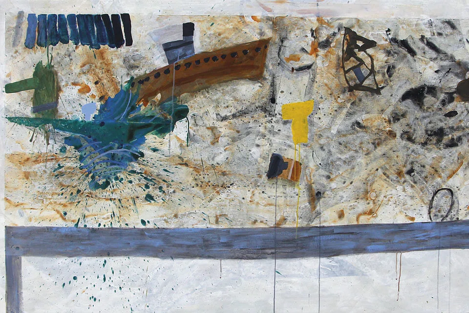 Random abstract shapes float across the canvas, sometimes colliding with identifiable forms such as a ship, a table or a postcard. The backgrounds - often rich and watery - provide a delicate and weightless landscape that holds the forms together.