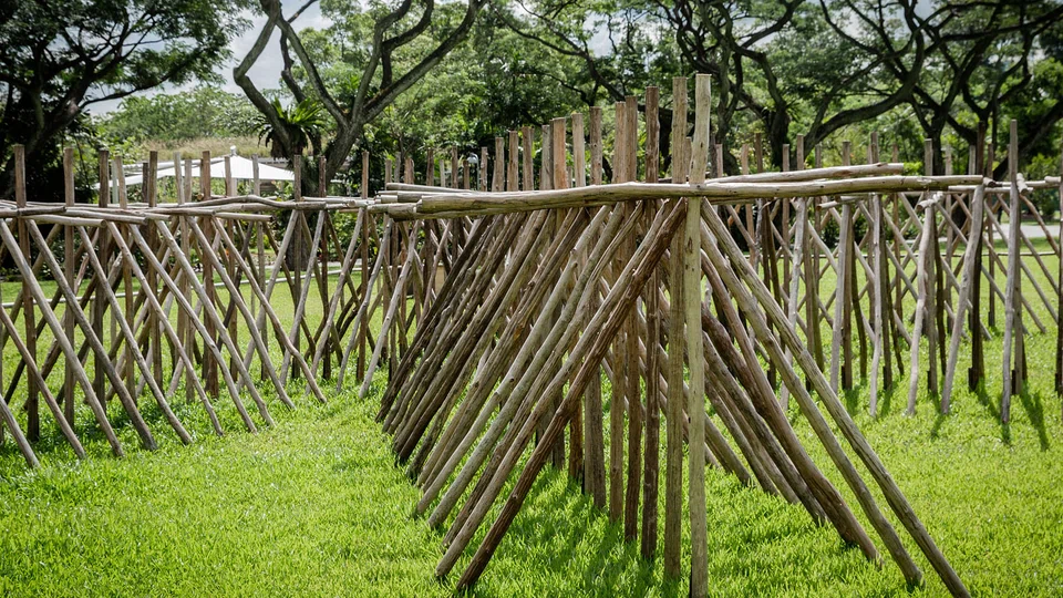 Among the 14 commissioned works, one of the standouts is Ang Song Nian's When A Tree Becomes A Forest. The monumental installation in Jurong Lake Gardens consists of 195 wood structures that each form the Chinese character "mu", meaning "wood". The structures are arranged in a cluster, such that an aerial view of the work yields the Chinese character "sen", meaning "forest".