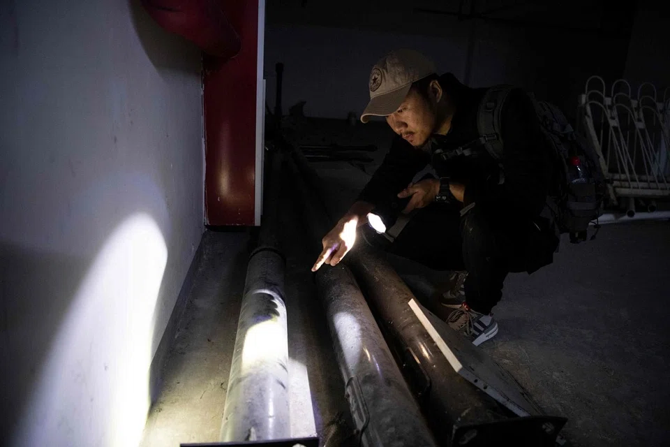 When Mr Sun spots an opening in a rock, he pushes the small lens of the endoscope - a small camera at the top of a long chord - inside the gap.