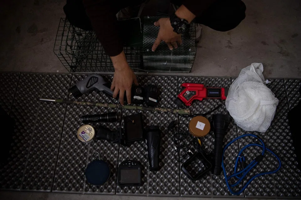 He walks around pointing a heat detector around the garage. He inspects some excrement on the floor, but determines it is not from the animal he's looking for.