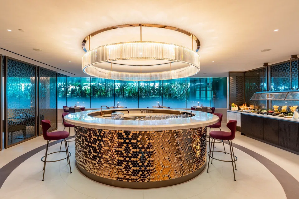 Spanning across 700 sq m and with a seating capacity of 85, the new lounge oozes luxury with its marble-lined décor, modern contemporary theme inspired by Arab architecture, muted palette, designer furniture, spacious layout and fine dining areas. Paying homage to Singapore's affinity for horticulture, the lounge is lined with brilliant displays of greeneries and botanical walls. At the same time the exclusive space offers a relaxing and soothing respite to busy businessmen and executives.