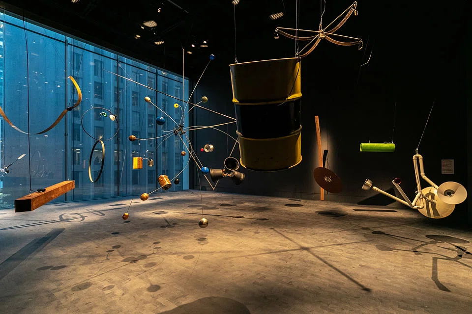 Throughout the room hang about 20 mundane objects, including a metal barrel, a wooden box, a lampshade, a reflective disc, a glass jar, a vintage computer's hard drive and more.