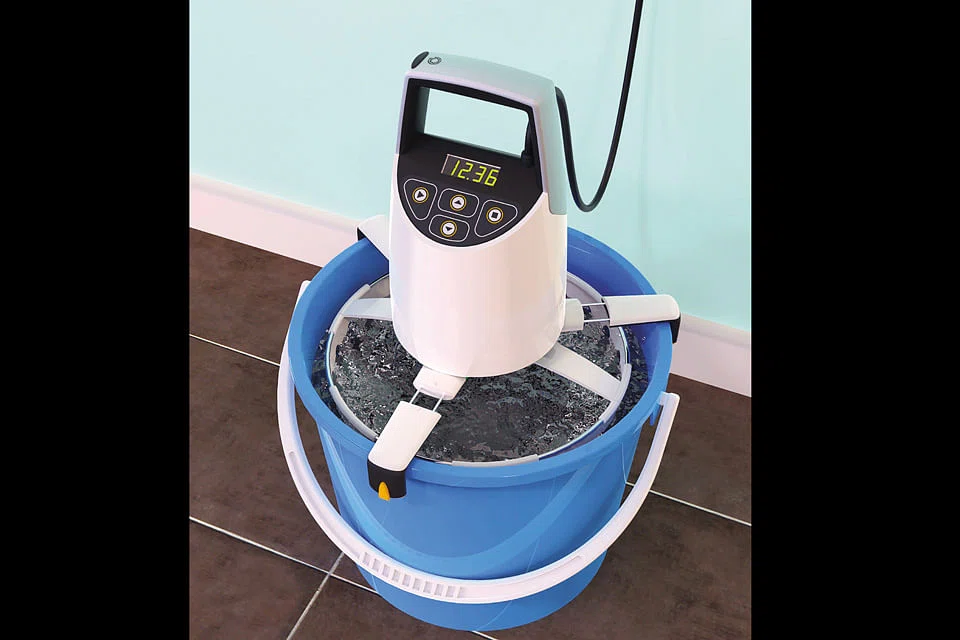 The control interface's simple and approachable design consists of only four buttons; start, stop, timer up, and timer down. Once washing commences, the basket moves in rotational motion. Once washing completes, the pail is emptied and Swash transforms into a dry spinner. The activation button located on Swash's handle indicates the hand position required to grab the unit in order to begin. The basket keeps the clothes in and filters the water out into the pail and with that, the process is complete.
