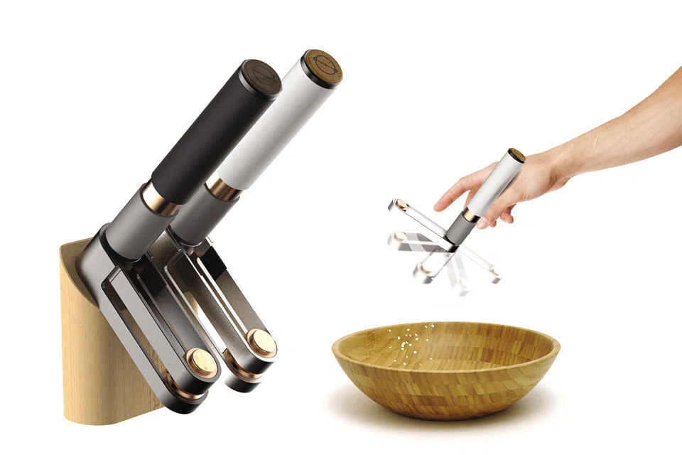JONATHAN Saphiro Salim, an undergraduate at the Lasalle College of the Arts, is on a mission to make your kitchen countertop more exciting with his version of the salt and pepper grinders. Piperine and Crystalline come equipped with a cylindrical weight at the end of their spinning shaft. With this weight, the grinding process can be performed with only one hand. As the grinding process uses centripetal force, less effort is required from the user compared to conventional mills. The user only needs to move the shaft in a circular motion, and this causes the weight attached to the end of the metal frame to spin, activating the grinder. The refilling process is done simply by sliding out the semi-circular cylinder container. When not in use, the grinders can be neatly kept away in a specially constructed dock.