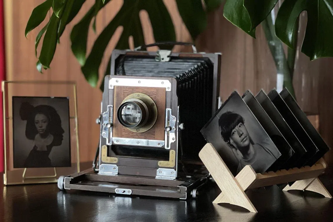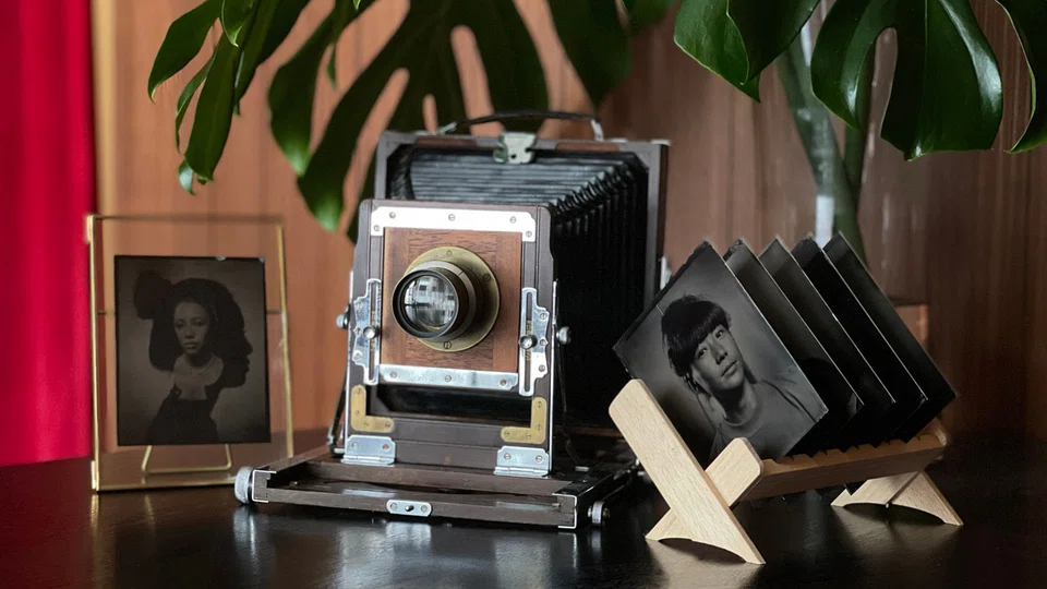 Instead of a portrait printed on paper, wet plate tintype photography shows the image on a metal plate. Some equipment that Mr Lee uses include an analog camera, thin aluminium plates and a variety of photosensitive chemicals.